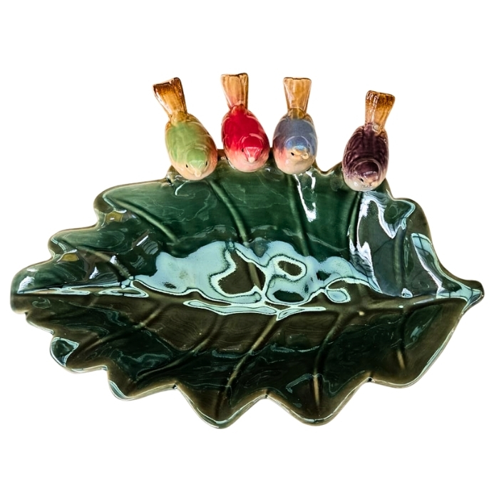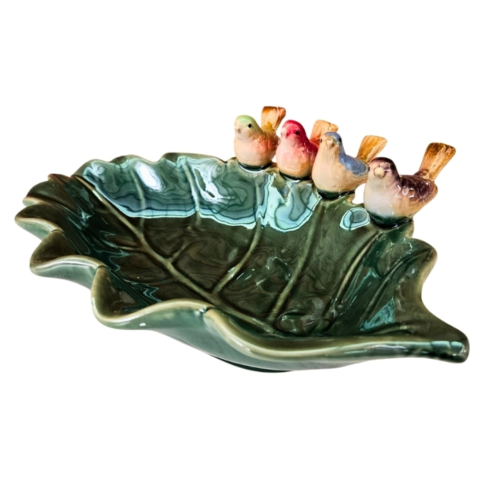 Com design inspirado na natureza, a base em formato de folha na cor verde esmaltada recebe delicados pássaros decorativos, tornando a peça um destaque na composição do ambiente. Além de funcional para acomodar frutas, também pode ser utilizada como centro de mesa decorativo.